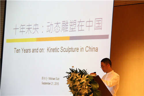 当日下午,在清华美院多功能厅相关领域专家、学者、艺术家共济一堂举办了以“中国动态雕塑的背景、教学与实践”为主题的学术研讨会,其中孙振华博士担任学术主持。研讨会邀请国际动态艺术组织中国区执行总监粟多壮先生、清华大学机械学院赵景山副教授、清华美院信息艺术设计系师丹青老师、清华美院雕塑系陈辉副教授、鲁迅美院雕塑系青年雕塑家汤杰、西南交大艺术学院邓乐教授、上海大学美术学院雕塑系罗小平教授就中国动态雕塑的学科状态、教学情况及创作现状分别做精彩演说,同时有九名专家学者参与评议,场下听众踊跃互动,现场学术气氛热烈。