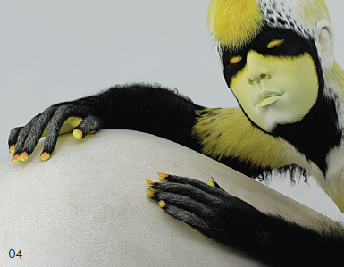 UNMASK的新作让我们的期待变得更加踏实了,这批新作品无论从艺术语言、观念还是制作工艺与技巧和视觉冲击上来说,都是UNMASK的一个突破,也是新观念雕塑的一个突破。这几件体积大却视觉上显得空灵的雕塑作品,仍然延续了UNMASK一直以来的对自我的诗意化描述和想象的母题。与上一批作品“半透明”不同的是,这一批作品非常“实在”,“实在”得纤毛毕现。UNMASK创造了一些类人的生物,它们有着人的基因和面貌,却异化成身上长出华丽而优雅的、白色、黄色、紫红色、黑色以及相间的美丽毛发,就像动物世界中美丽的动物皮毛斑纹一样。但从毛发的底层透出的粉红色肉色我们又能清楚地看到人的皮肤和气息。这些皮毛象征了在这个科技发达、经济发达的时代人的异化和自我保护,就像动物 的皮毛和色彩是动物用来在野外保暖以及保护、隐藏自己的保护色一样。巧合的是,今天国际上遇到了经济寒冬与这组作品中人物长上了厚厚的皮毛,正好相互映证了当今的人类是多么需要肉体和精 神的自我保护。在一个人们不知所措的年代,艺术家用自己的艺术想 象找到了一种心灵自我保护的形象。这既是一种艺术的想象,又是一种对现实的批判。让我们欣赏这些艺术品来得到心灵的抚慰吧。UNMASK创造那些似人非人的形象都有着美丽而安全的皮毛,却形单影只,忧郁而伤感,他们坐在纯白色的巨大光滑鹅卵石上,在白色的空洞之穴中,独自相处。就像这个时代的忧郁和孤独,让人很容 易想到自己在这个大时代的无助和迷茫。其中有一件作品是三个长着不同斑纹的白色皮毛的人以各种不同的姿态同处一个光滑白色洞穴之中,他们或蹲,或趴在白色巨大卵石上,就像某种动物在享受午后的阳光,在小憩。但与动物的神态不同的是,这三个人物都有着一种思考的表情、深沉的表情、智慧的表情。作品中隐喻着某种社会关系和人的生存状态。艺术家创造出非现实的自我,让人类无法解脱的困境和没有答案的思索在艺术的语境和想象中自我轮回和排解。这也是一种理想主义和对自我的深度放逐。