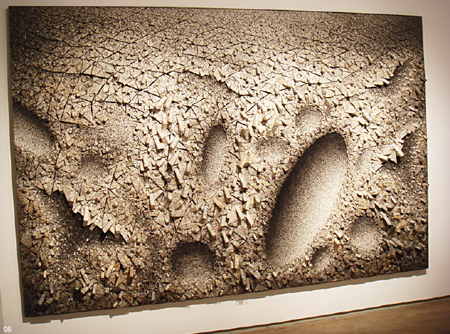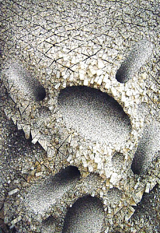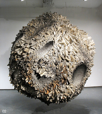 全光荣1944年出生于韩国首尔,在韩国艺术专业毕业后赴美国费城艺术学院(M.F.A., Philadelphia College of Art)继续深造,他在美国、日本、韩国举办过多次展览,其作品强烈的“东方艺术特色”受到西方当代艺术界的推崇。在高科技材料普遍应用于雕塑领域的今天,全光荣选择了一种历史悠久的、传统的韩国手工制纸――桑椹纸。在韩国文化生活的历史中,桑椹制纸扮演了特殊的角色,它几乎贯穿了整个朝鲜王朝,即使在工业文明发展时期,依旧为人民的日常生活所服务,深受韩国普通大众所喜爱。“桑椹纸”,是将桑椹的植物纤维制成纸浆,经过处理成为表面柔软,韧性较好的纸张,它常常作为包装材料、传统韩国绘画用纸。那些成长于20世纪50年代的韩国人可能还会回忆起,桑椹纸出现于日常生活的角角落落,它价格低廉,且用途广泛,很多家庭用它来包裹鸡蛋鱼类等食物,用以保证食物的新鲜,在建筑方面,这种纸还作为墙纸或是用来糊门窗等。在最近的数十年中,韩国的桑椹纸文化几乎消声匿迹,韩国的青少年一代深受西方的影响,电子媒介和新书写手段的冲击,越来越多的年轻人远离了韩文的书写;工业化大生产低廉的成本,冲击了韩国传统手工造纸行业,价格廉价的工业制纸取代桑椹纸而广泛应用于包装、建筑方面,电子通讯技术的发展使人们对书籍的阅读需求减少,使桑椹纸文化更加远离了韩国的现代生活。今天在韩国现代化的都市里,已经很少能够见到桑椹纸的影子。全光荣将这种传统的生活记忆通过雕塑呈现给世界,并加以创造。艺术家将绘有图案的桑椹纸覆盖于聚苯乙烯的表面,形成不规则的多面体,这些多面体成为一切作品形成的基本元素。从点到面再到体,成千上万的“元素”聚合成为有机形体。聚合"Aggregation"这一概念,从语义学上升到了艺术形式的表达。在他90年代的早期作品中,他钻研于创造一种浮雕效果,将“元素”依附于木栅栏之上,形成了凹凸的、如月球表面的效果。随后纸的轻盈飘转,被最大限度地发挥,那些神秘的、遥远的星球浮现出来,如果观者靠近作品会发现,这些小小的元素每一个都复杂而精准,符号,汉字,相互影响构成东方特有的玄学、哲理,而这些物象相互嵌接、榫牟、聚合的成为一个新的有生命力的形体。策展人理查德克莱因Richard Klein指出, “全光荣已经影响了年轻一代的艺术家,他将传统的概念拓展并将其呈现给世界的观众。在他的作品中,文字埋藏于形式之中,构造出了从地面上生长起来的有机物,那些类似于岩石的结晶形成了不朽的、不规则的自然景象,它不仅深刻地嵌入了韩国的艺术史,也成为人类古老的也是现代的生活的反映。”